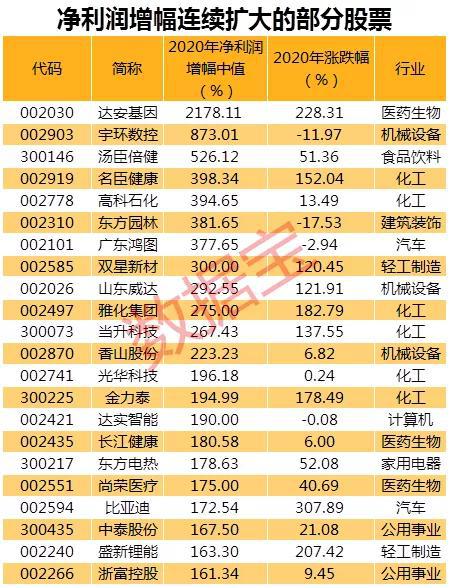 股票得以持续上涨,最大的动力应该是盈利能力的改善,数据显示2020年近三个季度业绩增幅连续扩大的公司有87家。26股的2020年业绩增幅中值超过三季报业绩增幅100个百分点以上,其中汤臣倍健、广东鸿图、宇环数控、达安基因4股超出350个百分点。