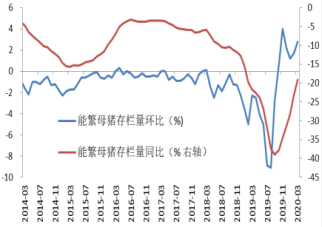 2019年下半年以来,各养殖主体的防疫能力普遍有所提高,非洲猪瘟疫情的传播得到一定控制,同时在高养殖利润和强政策激励的双重作用下,我国生猪产能开始恢复。能繁母猪存栏量的恢复是未来生猪出栏恢复的先行指标,农业农村部的数据表明能繁母猪存栏量自去年10月以来环比持续增长,从能繁母猪到外三元出栏最快要10个月左右,因此我国出栏生猪量预计到2020年8月以后可以见到明显的恢复。不过需关注三元留种比例较高的问题, 三元留种占比增加,PSY 大幅下滑且母猪淘汰量偏高,生猪产能恢复进程需等待市场验证。