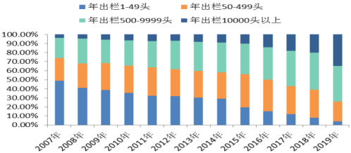 近年来我国生猪养殖规模化发展速度加快,我国生猪规模化养殖步入快速发展轨道是从2007 年开始,在国家政策引导及市场自我淘汰等因素影响下,散养户数量不断下降, 2018 年年出栏 500 头以上的规模猪场总出栏量占比从 2007 年的 26.1%提高至 61.0%。全国年出栏 1 万头以上的养猪场合计出栏量由 2007年 2096 万头增加至 2018 年约 13876 万头,十一年间增长近 7 倍。此外, 2018 年全国大型规模养殖集团合计年出栏量超 7000 万头。2007-2018 年,十一年间散养户大量退出,但生猪出栏量降了 22.78%,上规模养殖场增幅相对明显,平均增幅为 17.50%。其中年出栏 500-9999 头的养殖场占比提升最快,2018 年出栏量占总出栏量的比重在 41.00%,较 2007 年提升 18.70%;年出栏 10000 头以上的增速也相对较快, 2018 年占比较 2007 年上升16.30%。