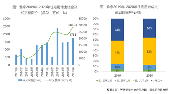2020年住宅用地成交金额为1738亿元,同比上涨16%,成交楼面价为28823元/㎡,同比上涨24%。这主要受成交结构影响,一方面,2020年宅地成交区位向城中靠拢,拉动整体土地出让金上涨。据统计,2020年六环以外宅地成交规划建面占总体成交规划建面的比例为36%,相较去年下降了6个百分点,而这部分房源2020年的成交均价为17293元/㎡,低于整体市场成交均价40%,六环外成交量占比的减少成为导致土地出让金上涨的因素之一。另一方面,今年成交多宗鲜少供地的优质区位地块,例如上半年成交了2宗海淀区地块,以及两宗地理位置较好的丰台分钟寺地块,其对整体成交价格起到一定的拉升作用。总体来看,供地结构的变化为拉动今年土地出让金上涨的主因。