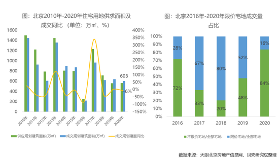 2020年商品住宅供应面积801万㎡,成交面积702万㎡,供销比为1.1,供求平衡。2020年商品住宅成交量呈现先抑后扬的走势,上半年受疫情影响成交量同比下滑近3成,下半年逐渐恢复,全年成交量同比上涨5%,其中限竞房成交量逐年提升,成为拉动整体成交量上涨的因素之一。限竞房自2018年开始入市,且近三年限竞房成交量占整体市场成交量的比例逐年上升,2020年成交占比接近五成。如前文所述,未来仍有充足的限竞房产品补充市场,预计明年限竞房仍将对整体市场成交量起到较好的支撑作用。