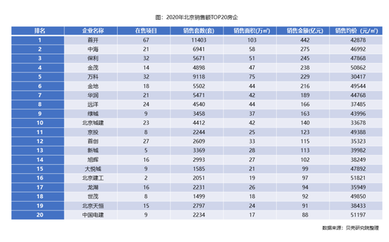从房企端来看,TOP10房企基本保持稳定,其中2020年销售额排名前三的房企为首开、中海及保利,成交金额分别为442亿元、275亿元及245亿元。2020年销售面积排名前三的房企为首开、万科及中海,成交面积分别为103万㎡、75万㎡及58万㎡。首开在成交均价略低于全市均价的情况下,保持成交金额和面积排名第一,且分别超越第二名61%和37%,在北京市场保持绝对的领先位置。成交均价方面,建工、电建以及金茂保持5万元以上单价。其中仅金茂年内仍在北京积极取地,且从取地情况来看,金茂无论独立取地,还是合作项目均达到7万元以上楼面价,未来其在北京新房市场将保持高端项目开发商形象。