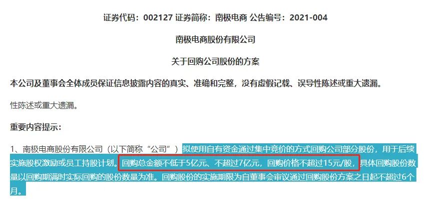南极电商表示,拟使用自有资金通过集中竞价的方式回购公司部分股份,用于后续实施股权激励或员工持股计划。回购总金额不低于5亿元、不超过7亿元,回购价格不超过15元/股。