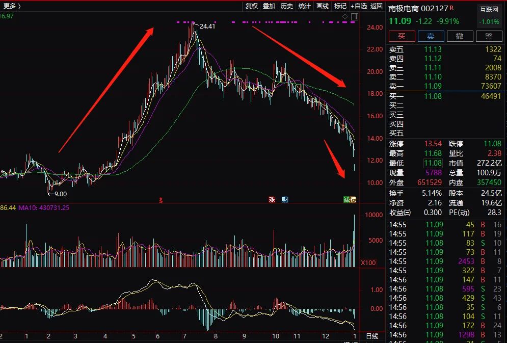 1月4日,A股公司南极电商开盘后闪崩跌停后;1月5日,南极电商开盘后又是直奔跌停;300多亿的电商股,在连续跌停打击下,1月5日收盘价11.09元,最新市值为272亿元。