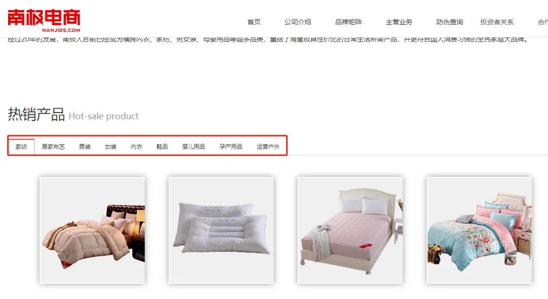南极电商此前广为人知的是南极人保暖内衣,然而该公司早已不再是生产内衣的品牌,而是转型卖“吊牌”,公司产品涉及到方方面面,热销产品包括家纺、布艺、男装、女装、内衣、鞋品、婴儿用品、户外等等,被人戏称“万物皆可南极人”。