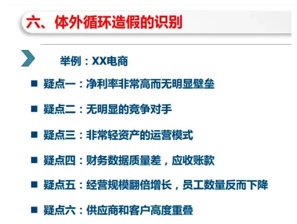 一家机构在通过“体外循环造假的识别”时,将“XX电商”作为案例分析,体外循环公司常见的特点包括:净利率超高、无明显竞争对手、资产非常轻、高增速、高市盈率。