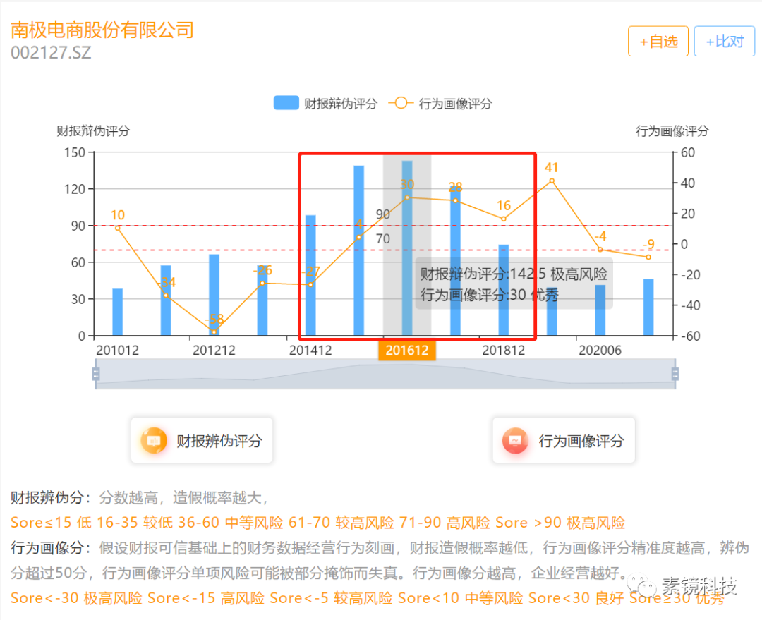 从下图可见,南极电商2014年至2017年造假程度“极高”风险预警,主要体现在:1、虚增、虚构应收账款、收入。2、费用成本异常,调节利润。3、借道非经营性资产,体外循环资金。4、计提损失,毁灭、虚增利润资产。进入2020年经营明显下降,虽然近年财报辨伪分有所下降,但受历史记账影响,科目项仍有异常波动,预警维持在中等水平。