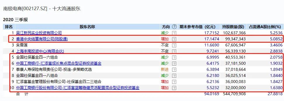 在2020年三季度末前十大流通股东中,包括北上资金、公募基金、社保、保险等机构都现身。汇添富、泰康人寿、中欧基金、南方基金等众多机构投资者持有南极电商。