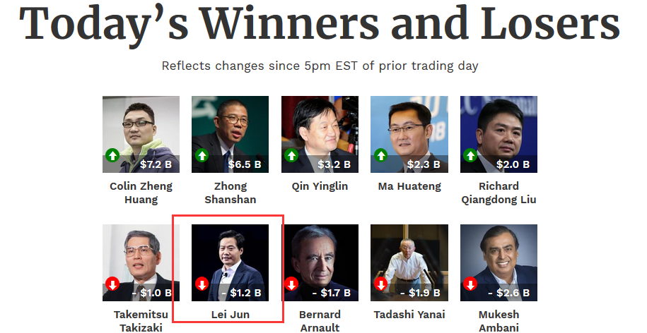 福布斯实时富豪榜显示,今天雷军是全球富豪中最大的“输家”,个人身价一天减少12亿美元,约合人民币78亿元。