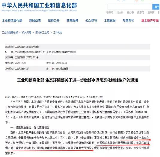 元旦节前夕,工信部和生态环境部联合发布了《关于进一步做好水泥常态化错峰生产的通知》,提出要推动全国水泥错峰生产地域和时间常态化,合理缩短水泥熟料装置运转时间,有效压减过剩产能,避免水泥熟料生产排放与取暖污染排放叠加,减轻采暖期大气污染。