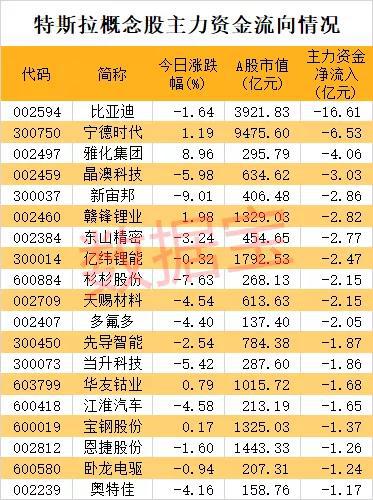 概念股整体主力资金净流出达到72亿元,比亚迪、宁德时代、雅化集团、晶澳科技、新宙邦、赣锋锂业、东山精密等净流出额在2亿元以上。比亚迪净流出资金16.61亿元排在首位,同时也是两市所有股票中净流出金额最大的1只,该股尾盘收跌1.64%。