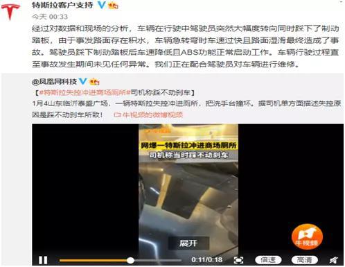 降价消息才过没几天,“特斯拉失控冲进商场厕所”的新闻再次让特斯拉成为关注焦点。@特斯拉客户支持于1月6日凌晨(金麒麟分析师)转发微博回应称,经过对数据和现场的分析,车辆在行驶中驾驶员突然大幅度转向同时踩下了制动踏板,由于事发路面存在积水,车辆急转弯时车速过快且路面湿滑最终造成了事故。