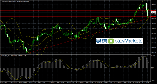 1月7日,由于民主党获得参议院的控制权,市场认为这为下一届政府实施大规模财政政策扫平了道路,市场风险偏好情绪升温,美股大幅上涨创出新高,而黄金则回吐此前涨幅最低下跌将近50美元,逼近1900美元关口。而在美国大规模财政刺激预期的的推动下,美元指数低位反弹,不过目前又冲高回落。