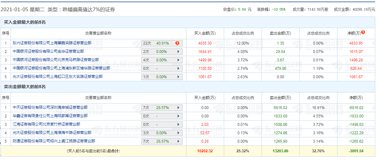 前述五个营业部当日卖出全新好的金额均在千万元以上。其中处于卖一位置的中天证券股份有限公司深圳海岸城证券营业部当日卖出金额约6816.02万元,华鑫证券有限责任公司上海陆家嘴证券营业部、江海证券有限公司北京紫竹桥证券营业部、光大证券股份有限公司上海淮海中路证券营业部、财通证券股份有限公司绍兴上虞江扬路证券营业部卖出的金额分别约1833万元、1500.06万元、1274.96万元、1265.9万元。