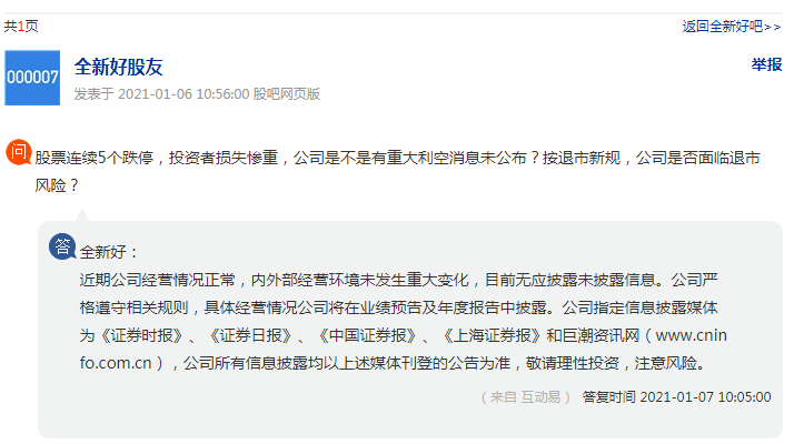 对于持续不断下的跌,投资者可谓是损失惨重,有股友也在投资者互动平台上质疑全新好是不是有重大利空消息未公布?按退市新规,公司是否面临退市风险等问题,希望可以找到股价下跌的答案。