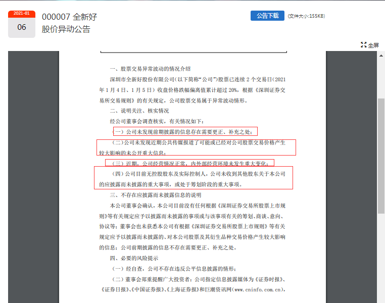 1月5日晚间全新好披露的股价异动公告称,公司董事会确认,公司目前没有任何根据《深圳证券交易所股票上市规则》等有关规定应予以披露而未披露的事项或与该事项有关的筹划、商谈、意向、协议等。