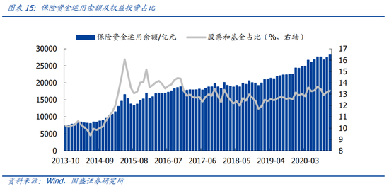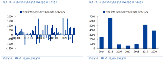 2020年11月保险资金投资股票和基金规模增加757亿元,较上月多增50亿元,2020年前11月合计增加3861亿元。险资权益投资披露口径为股票和基金合计占比,直接股票投资占比不定期披露。截止2020年11月,险资运用余额达到21.21万亿,其中股票和基金投资规模为2.82万亿,占比为13.31%,较上月分别增加757亿元、增加0.13pct。