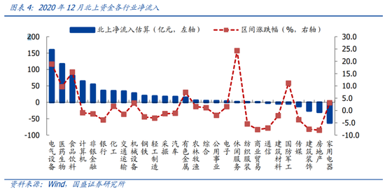 2020年12月北上主要净流入电气设备、医药生物和食品饮料,分别净流入160亿元、117亿元和81亿元;同时,家用电器、房地产和建筑装饰行业流出居多,分别净流出63亿元、30亿元和26亿元。