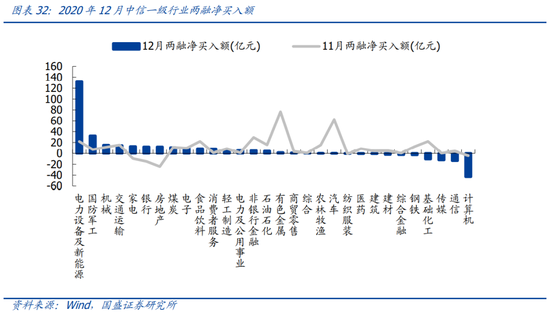 2020年12月两融流入电力设备与新能源、国防军工、机械、交运、家电等行业,流出计算机、通信、传媒、基础化工、钢铁等行业。