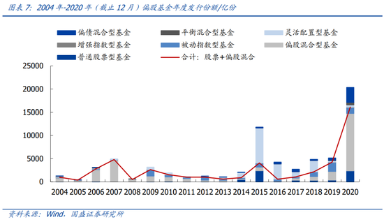 2020年(截止12月)偏股基金(股票型+混合型)共发行20335亿份,为历史最高。其中,股票型+偏股混合型共发行16106亿份,亦创历史最高。