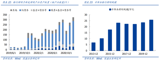从新产品发行来看,重点跟踪银行理财子公司产品发行,将其理财产品分成四类:股票+基金+债券等、基金+债券等、仅债券、其他。2020年12月银行理财子共发行324支理财产品,四类产品分别占比为10%、10%、69%、11%。2020年全年银行理财子累计发行2545只理财产品,四类产品分别占比9%、9%、68%、13%。