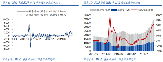 2020年11月偏股基金(股票型+混合型)净增加份额为1388亿份,净增加净值(估算)为1577亿元。根据基金业协会最新月度数据,2020年11月偏股基金(股票型+混合型)份额共38749亿份,较上月净增加了1388亿份;净值共58842亿元,用中证股票基金指数和混合基金指数的收益率来剔除净值变动的贡献后,2020年11月净流入1577亿元。2020年前11月偏股基金(股票型+混合型)净增加份额为14617亿份,净增加净值(估算)为14330亿元。