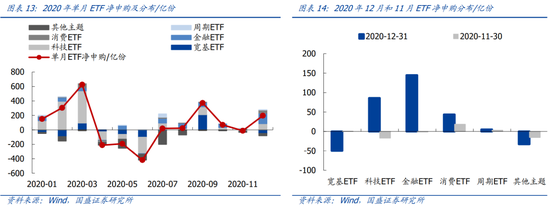 2020年12月ETF净申购196.5亿份,其中金融ETF净申购最多,宽基ETF净赎回最多。2020年12月ETF净申购196.5亿份,比上月增加了208.4亿份,其中金融、科技、消费、周期、宽基、其他分别净申购144.6、85.9、43.6、5.1、-49.9、-32.8亿份。2020年前12月ETF净申购928.8亿份,科技、金融、消费、周期、宽基、其他分别净申购883.2、592.7、119.2、65.6、-76.4、-655.4亿份,科技和金融净申购最多,宽基和其他主题净赎回。