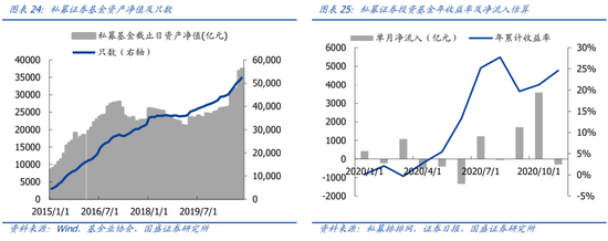 2020年11月私募证券基金净流出308亿元。根据基金业协会最新月度数据,2020年11月私募证券投资基金资产净值为3.74万亿元,基金只数为52599只,较上月增加621亿元、1403只。假设私募79%股票仓位,并用前11月私募基金累计收益率24.60%剔除净值变动贡献,2020年11月私募净流出308亿元,2020年累计达到5149亿元。
