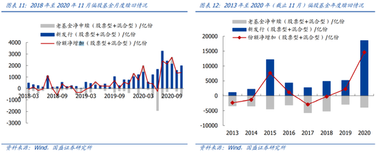 其中,2020年11月老基金净赎回592亿元,前11月老基金累计净赎回3942亿元,处于历史平均水平。以净增加份额减去新发行份额来估算老基金的净申赎规模,2020年11月偏股基金(股票型+混合型)净增加1388亿份,新发行1577亿份,可得2020年11月老基金净赎回592亿份,全年前11月累计净赎回3942亿元。