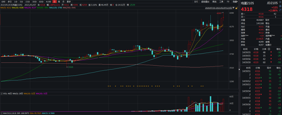 在昨日鸡蛋大涨4%之后,今日市场相对谨慎许多,上午开盘主力率先保持攻势上行,但随后动力不足转攻为守留一下一根较长上影线。而在元旦消费小高峰后,鸡蛋基本面出现交织,随着玉米豆粕的疯狂上涨,蛋鸡养殖利润进一步压缩养殖户继续挺价,但是随着鸡蛋价格涨至高位及疫情的影响,终端抵触情绪开始升温,蛋商采购较为谨慎。沉寂一年之久的鸡蛋到底还能一飞冲天吗?