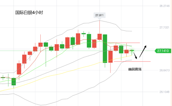 国际白银:周三白银冲高,一度刷新近四个月高位27.91美元,之后走势急转而下,银价大跌回吐日内全部涨幅后继续下探,一度跌破27美元关口位置,此后白银向上反弹,价格收于27美元关口上方,不过白银短期走势已经由强转弱,日内价格维持偏弱震荡整理。下方支撑:关注日线5日均线27.08美元附近,4小时布林带下轨26.9美元附近,也是日内低点位置,日线10日均线26.56美元附近,周三白银大跌低点位置。上方阻力:关注4小时布林带中轨27.27美元附近,1小时布林带上轨27.4美元附近,4小时布林带上轨27.63美元附近。总体而言,国际白银目前主要维持在27美元关口上方偏弱震荡整理,可以先关注26.9美元到27.4美元区间高度低渣即可。