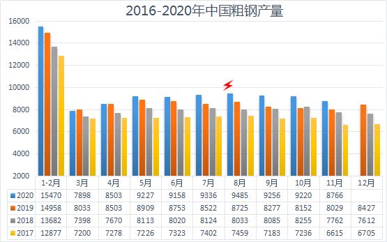 12月份数据暂未公布,若环比持平,2020年整体粗钢产量将超过10.5亿吨。其中,8月粗钢产量高达9485万吨,创历史新高。全年钢材产量超13亿吨,8月钢材产量逼近1.2亿吨,同样创历史新高。