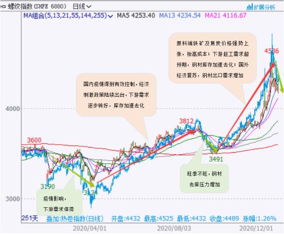 2019年高供给高需求的格局并未发生根本性变化,2020反而有过之无不及,粗钢产量突破10亿吨创历史新高、钢材库存自纪录高位回落至正常水平、内需超预期启动后外需也跟上节奏,此外原料端焦炭也加入到抬轿的行列,多重利好主力钢价涨势。