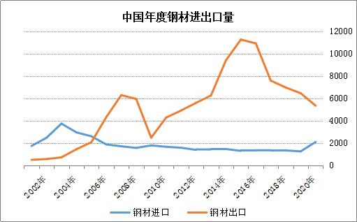 在疫情影响下,全年钢材出口先降后增,钢材进口先增后降。12月份数据按照环比持平估算,2020年中国钢材出口总量将达到5323.3万吨,环比降幅为17.3%;钢材进口则将高达2071.3万吨,较2019年增加68.36%,为2006年以来首次超过2000万吨。