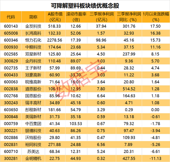 证券时报·数据宝梳理发现,可降解塑料板块内,个股数量较多,有40余只。剔除2020年三季度业绩表现不佳股外,还剩20股。这20股中,有4股在2021年1月1日限塑令正式实施以来,股价上涨幅度超10%,分别是金发科技、长鸿高科、恒力石化和中粮科技。