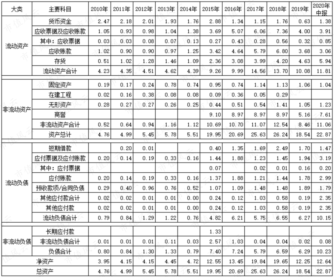 从资产结构看,截止2020年中报,总资产22.9亿元,其中流动资产11.8亿元、非流动资产22.9亿元,负债情况,流动负债10.2亿元、非流动负债不到1千万。