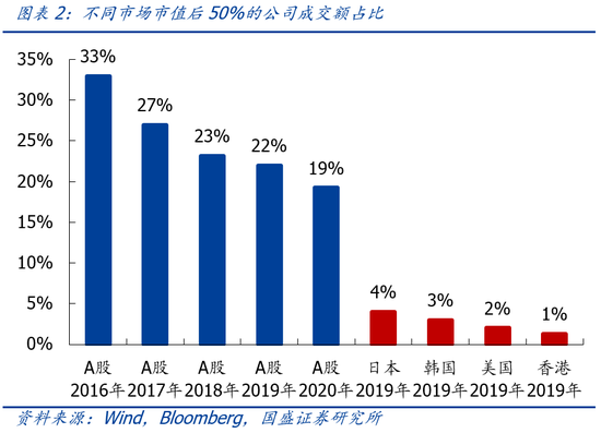 另一方面,参考海外成熟市场,资金向龙头集中也是必然趋势。未来A股的龙头集中度也将大大提升。尽管近年来A股市值后50%的公司成交额占比已从2016年的33%持续下降至2020年的19%。但对比美、日、韩、香港等海外成熟市场,其市值后50%的公司成交额仅分别占2%、4%、3%和1%。因此,A股市场资金向龙头集中的进程远未结束。