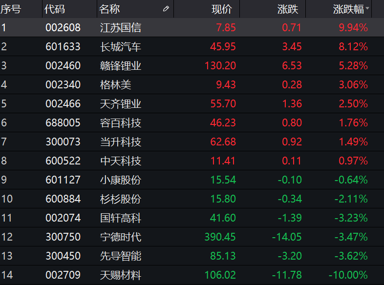 另一边,在固态电池领域有所布局的上市公司呈现涨势。据证券时报·数据宝梳理,相关上市公司有14家,其中江苏国信(002608)涨停,长城汽车(601633)、赣锋锂业(002460)涨超5%。