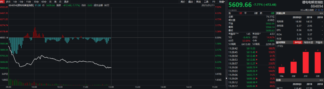 蔚来汽车“固态电池”横空出世,或对锂电中游环节产生冲击。锂电隔膜、电解液压力倍增,1月11日早盘全线大跌。截至上午收盘,Wind锂电电解液指数跌7.77%,锂电隔膜指数跌6.31%。