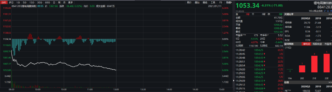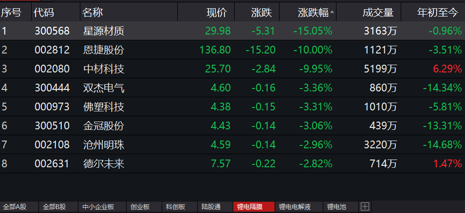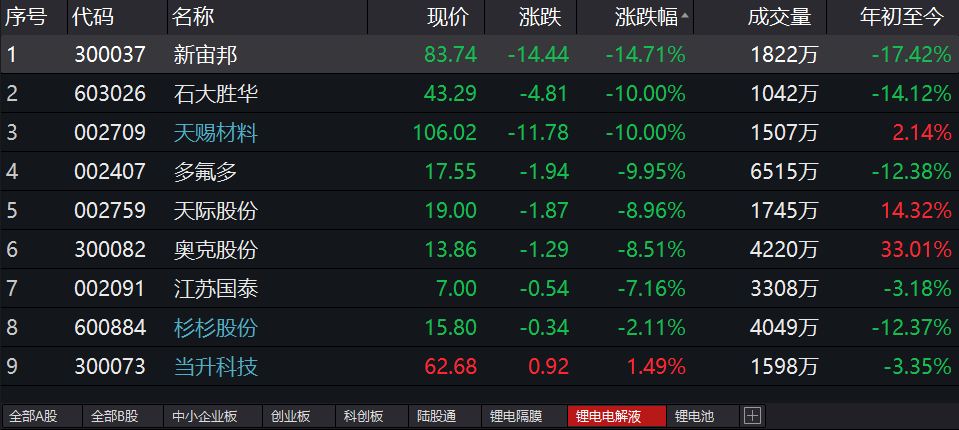 具体到个股层面,电解液板块中新宙邦(300037)跌幅最大,跌14.71%;石大胜华(603026)、天赐材料(002709)跌停。隔膜板块中,星源材质(300568)大跌15.05%,恩捷股份(002812)、中材科技(002080)跌停。