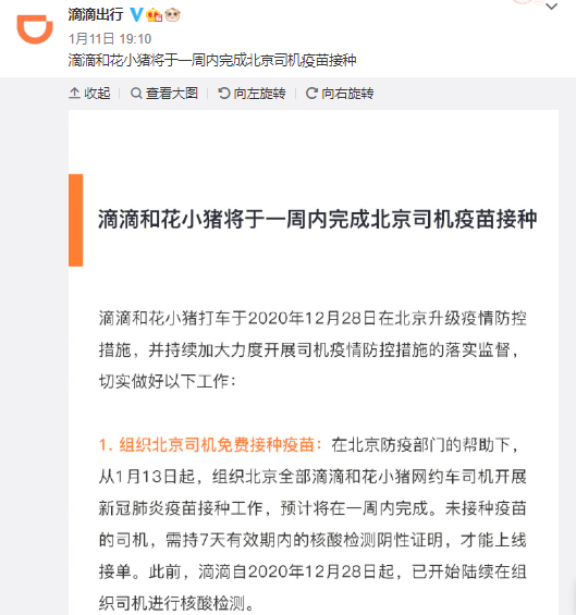 昨日,滴滴出行公告称,从1月13日起,组织北京全部滴滴和花小猪网约车司机开展新冠肺炎疫苗接种工作,预计将在一周内完成。
