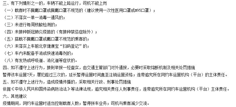 《规范》还对车辆不能上路运行,司机不能上岗的情形进行明确。包括载客时不佩戴口罩或佩戴口罩不规范的、不落实一单一消毒一通风的、未进行每周核酸检测的、未接种新冠肺炎疫苗、搭载不佩戴口罩或戴口罩不规范的乘客的、未落实上车前北京健康宝“扫码登记”的、车内未配备手消或快速消毒剂的,以及有发热或呼吸道、消化道等症状等。