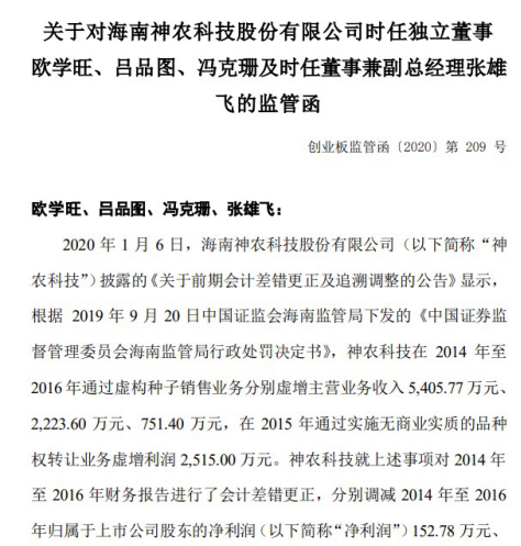 1月12日,深交所下发了关于对海南神农科技股份有限公司时任独立董事欧学旺、吕品图、冯克珊及时任董事兼副总经理张雄飞的监管函。主要事由还是由于神农科技虚增3年营收这一事项。