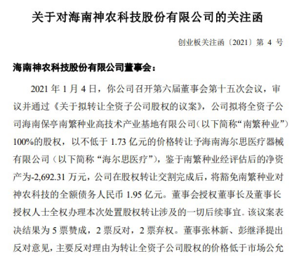 1月6日晚间,神农科技因为出售全资子公司收到了深交所的关注函。1月4日神农科技公告称,拟将全资子公司南繁种业100%的股权,以不低于1.73亿元的价格转让给海尔思医疗。