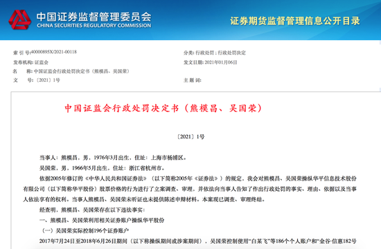 最终,熊模昌被证监会给予警告,处以205万元罚款,吴国荣被给予警告,合计处以185万元罚款。此外,证监会还对吴国荣采取3年证券市场禁入措施。