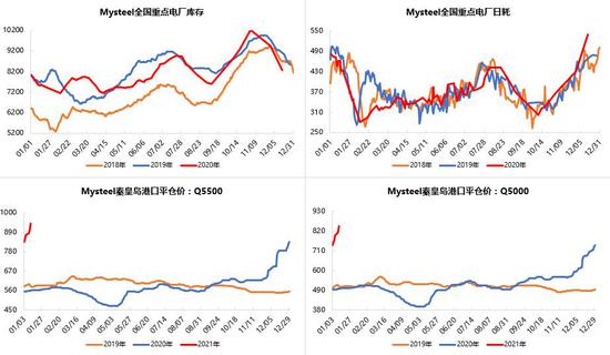 下游方面,当前冬季寒潮天气影响电厂日耗增加,电厂库存下降明显,目前市场补库积极进行,另外非电行业生产即将停工放假,阶段性供需矛盾开始减弱,在目前整体内紧外不足供需格局下,国内煤价高位上涨态势难以快速趋缓。