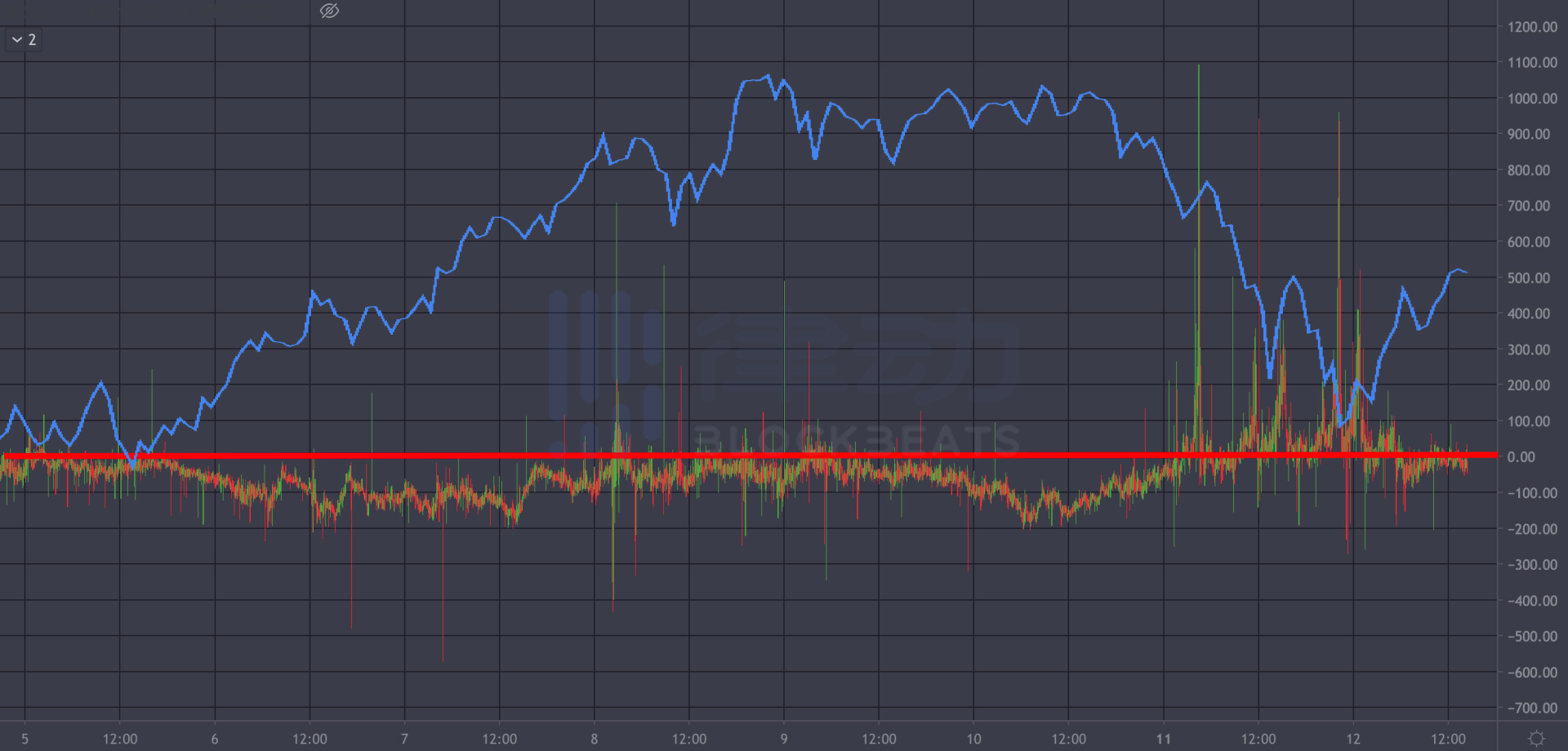 Binance 与 Coinbase 比特币价差 k 线图,红线为零轴,蓝线为比特币价格走势;价差大于零时,Coinbase 为负溢价