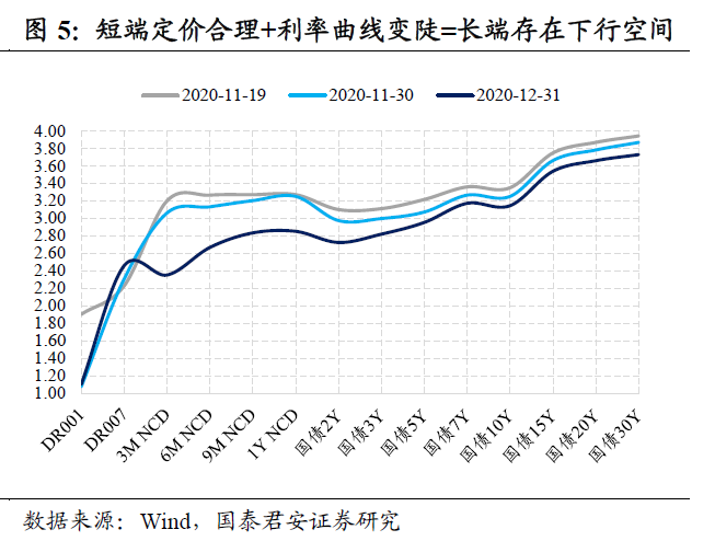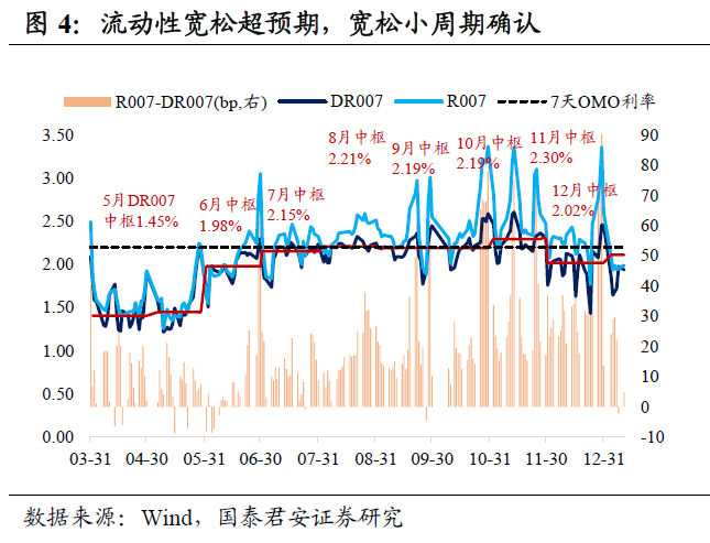 央行宽松小周期确认。央行释放三个短期宽松信号:①资金面持续放水:11月25日交易所GC007天量成交隐蔽放水+11月30日MLF月底意外投放+12月15日MLF天量净投放;②12月18日中央经济工作会议释放“不急转弯”信号;③12月29日央行四季度例会提出“巩固利率下降成果”。经济复苏基础尚不牢固,叠加永煤事件后信用融资功能受损,只有货币政策边际放松,才能兼顾稳增长与防风险。因此,隔夜资金利率一直处于低位,DR007中枢从11月的2.30%降至12月的2.02%。