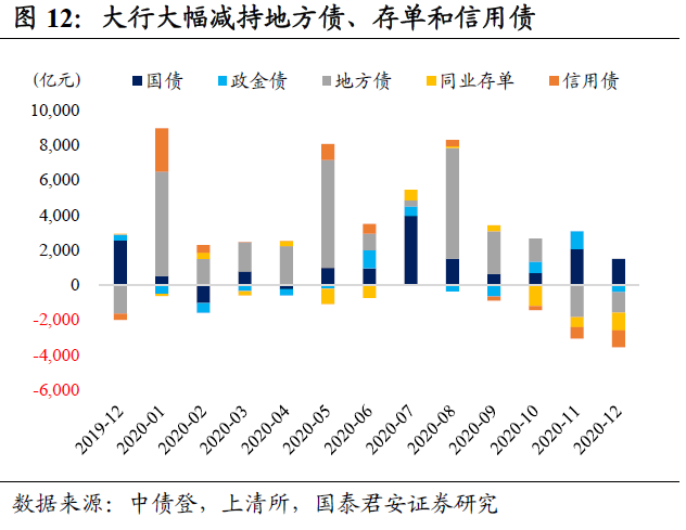 大行净减持利率债,大幅减持地方债、存单和信用债。全国性大行总托管量减少1514亿,较11月环比减少3083亿。3月以来首次净减持利率债,其中增持国债1496亿(环比减少535亿),减持地方债1175亿(环比增加673亿)和政金债423亿(环比减少1465亿),同时连续三个月减持存单,减持1023亿。另外,连续四个月减持信用债,减持964亿,其中减持超短融842亿和中票107亿。