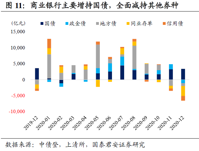 3)年底指标考核压力下,银行整体配置力量不强。商业银行增持国债,全面减持其他券种。大行净减持利率债,大幅减持地方债、存单和信用债。城商行配置力量较强,增持国债和存单,减持信用债和政金债。农商行需求下滑,仅增持国债和地方债。